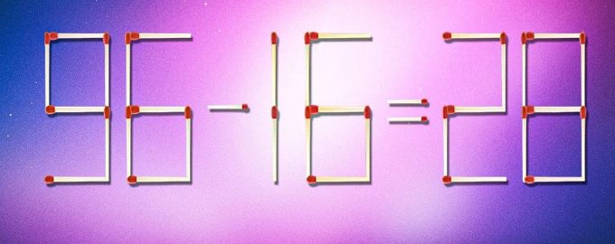 Az alábbiakban tehát a képet láthatjátok, ahol a gyufák egyenlőséget 96-16=28-ra vannak kirakva. De nyilvánvaló, hogy matematikai szempontból valami nem stimmel.