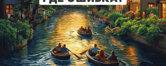 Ön előtt egy kép van, amely egy esti város gyönyörű tájképét mutatja. A házak között folyó folyik, amelyen csónakokban emberek úsznak. A kép első pillantásra normálisnak tűnik, de valójában egy durva hiba van benne.