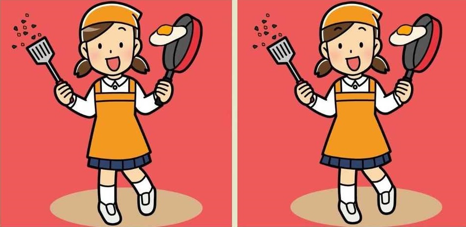 Mindkét rajz egy lányt ábrázol, aki rántottát készít. És úgy tűnik, hogy bajban van, mert a tükörtojás éppen a padlóra készül leesni a serpenyőből.