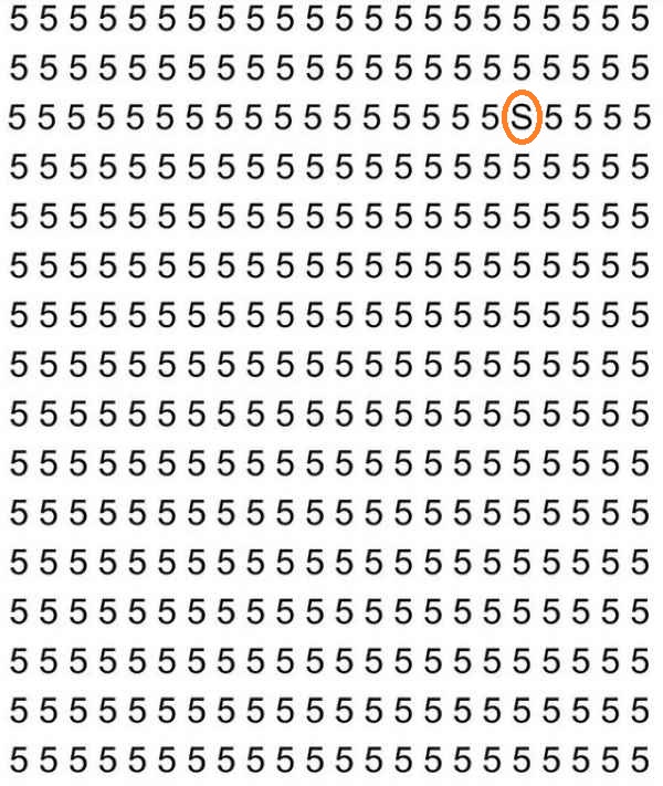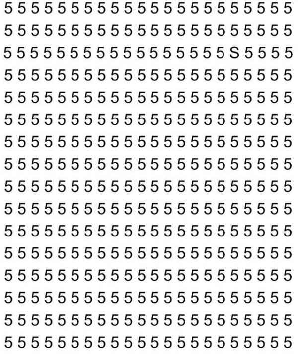 A képen rengeteg 5-ös számjegyet látunk, amelyek sorokba és oszlopokba vannak rendezve. Ha megnézzük ezt a képet, az első másodpercekben úgy tűnhet, mintha biztosan nem lenne sehol egy S betű. De ebben az első benyomásban nem szabad bízni – biztosan ott van, csak nem olyan könnyű észrevenni.