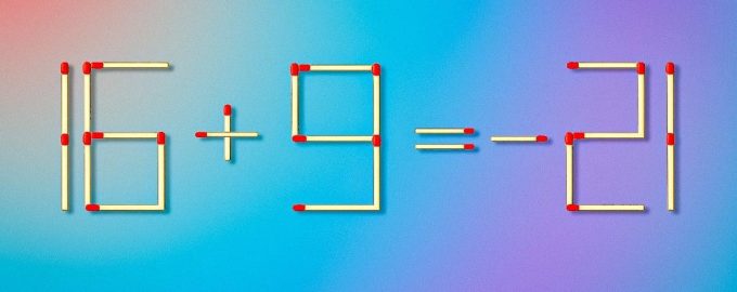 A képen – egy 26 gyufából álló hibás egyenlőség: 16 + 9 = -21. A feladatod az, hogy csak egyet húzz közülük, hogy az egyenlőség helyes legyen.