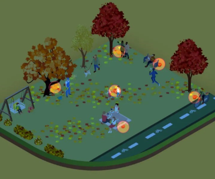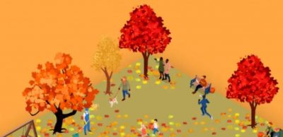 A képen egy őszi játszótér látható, ahol emberek és gyerekek sétálgatnak. Mindenki a saját dolgával van elfoglalva, de néhányuk mellett ott vannak a tökök, amelyeket keresünk.