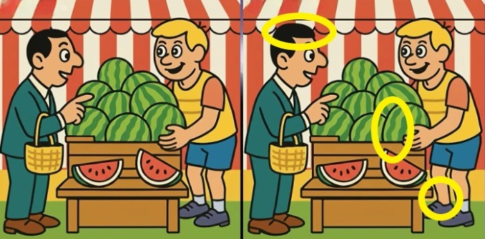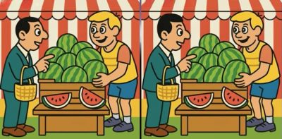 Készen állsz a kihívásra? Nézd meg alaposan a két képet, amelyeken egy görögdinnyét vásárló férfi látható. A képek elsőre egyformának tűnhetnek, de van 3 apró különbség. Gondolod, hogy mindegyiket megtalálod 27 másodperc alatt? Próbáld ki, és teszteld a látásélességedet!